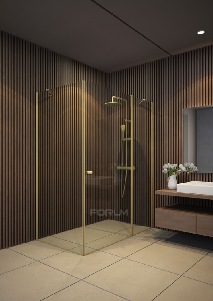 מקלחון 6 ממ מחוסם זהב מט גובה 185 פינתי קיר צד דופן קבוע ודלת פתיחה החוצה בלבד קיר צד 65 עד 90 דופן ודלת 70 עד 135