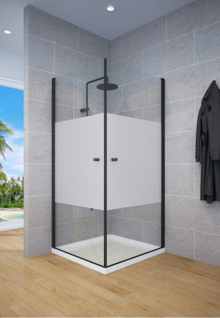 מקלחון פינתי 6 ממ שחור 2 דלתות פנימה והחוצה 80 על 80 או 90 90 גובה 185 פס חלבי